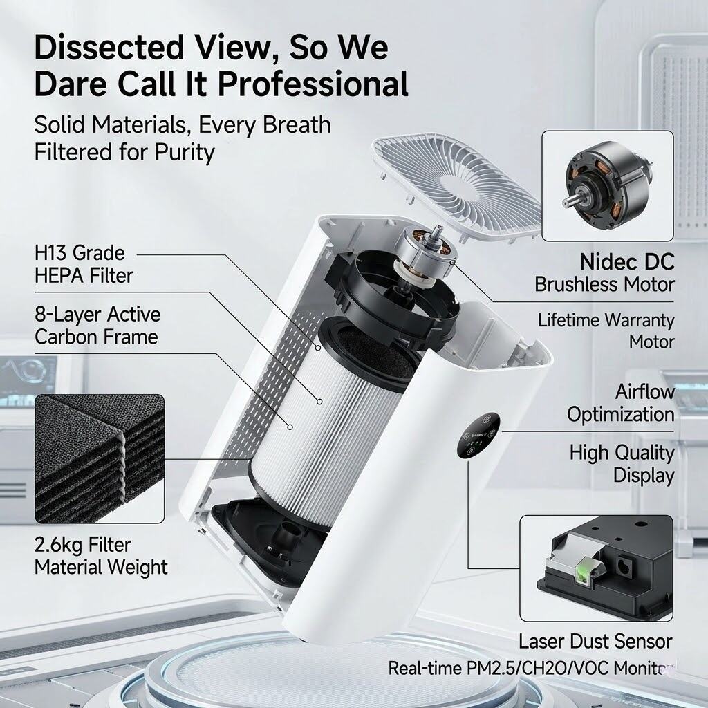 · Multi-Layer Composite Filtration: Our state-of-the-art composite filter is capable to trap e.g. large particles, dust and adsorb harmful gases like formaldehyde, hydrogen sulfide etc. that are released into the environment. The concept is simple - the filter includes a pre-filter to trap larger debris, a fine filter for dust, and a specially activated carbon layer that targets and neutralizes harmful gases.